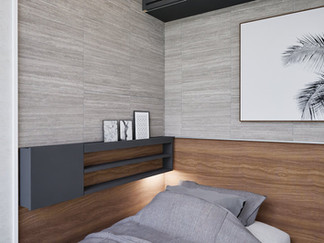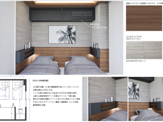 モルタルや石目の無機質な素材感に、温かみのある木目とシャープな黒を調和。クライアント様のご希望のホテルライクような、洗練された日常をデザインしました。生活感が出る家電やキッチン収納を黒のガラス扉で覆い、リビングは全体的にシャープさを追求したモノトーン調で、寝室や子供部屋、洗面室は木を多くして暖かく安らげる空間とした。